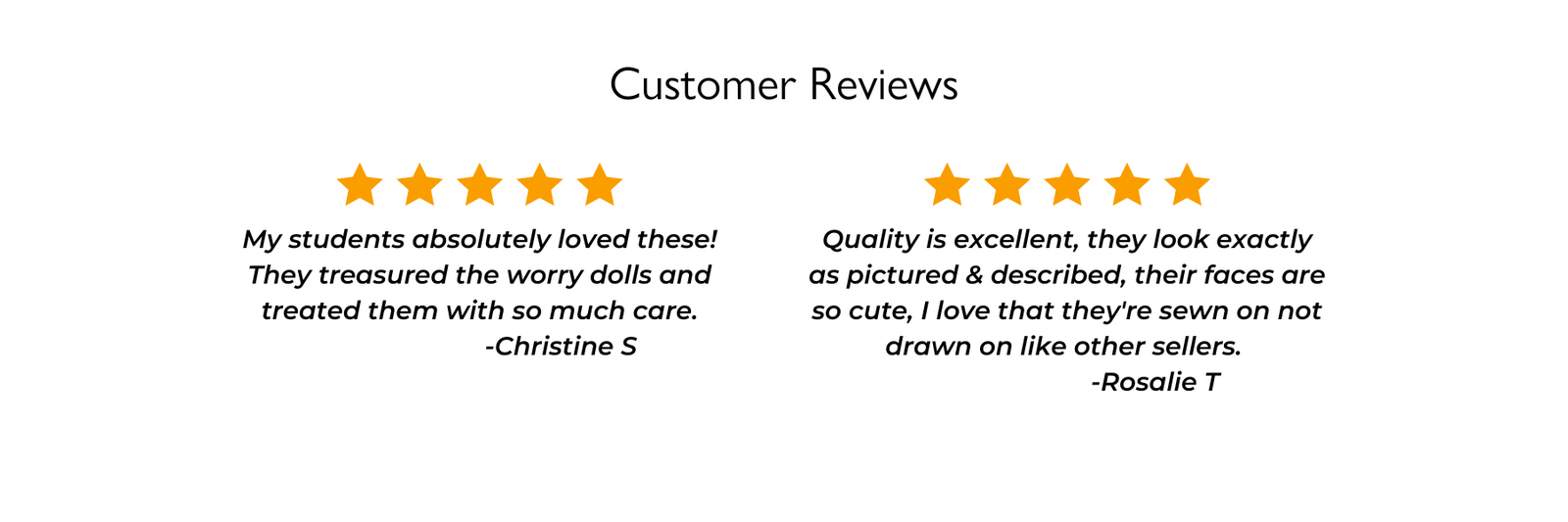 According to Guatemalan tradition, children tell their worries to the worry dolls and then place them under their pillow when they go to bed at night. The worry dolls shoulder the responsibility of the problem, freeing the worrier and allowing them to sleep peacefully. Come morning, the dolls have gifted the worrier the knowledge and wisdom to eliminate their worries.